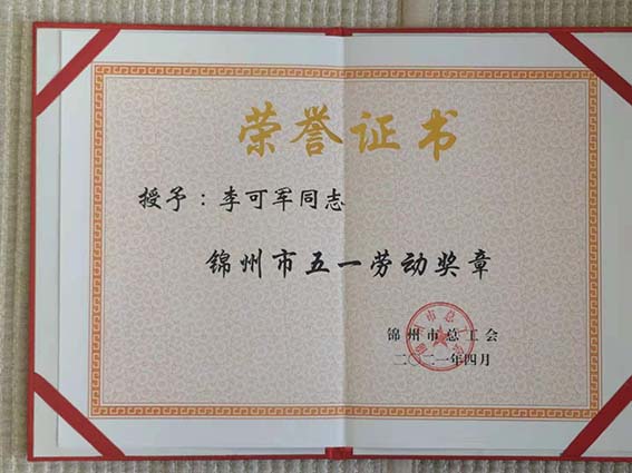 2021年412日,李可軍董事長榮獲“錦州市五一勞動獎章”榮譽稱號。